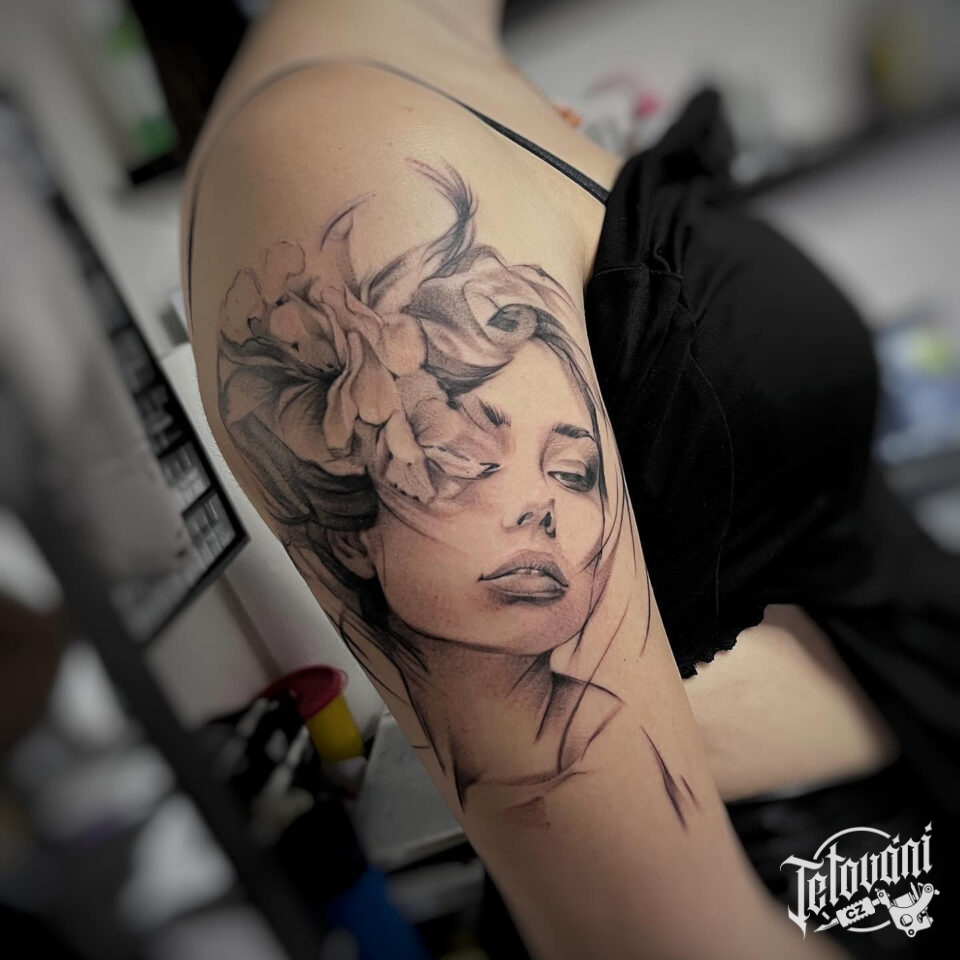 Tetování portrét ženy s květinou ve vlasech na rameni