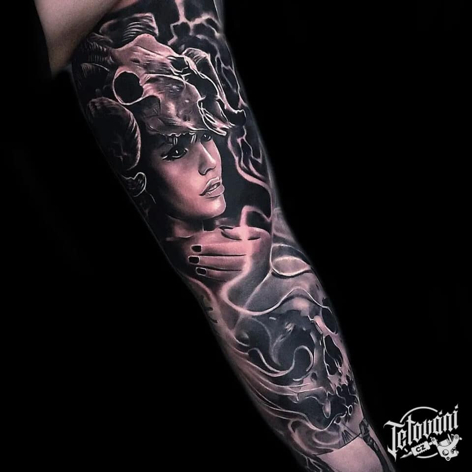 Severská tetování, portrét ženy s lebkami, severská mytologie, Valkýra na ruce