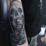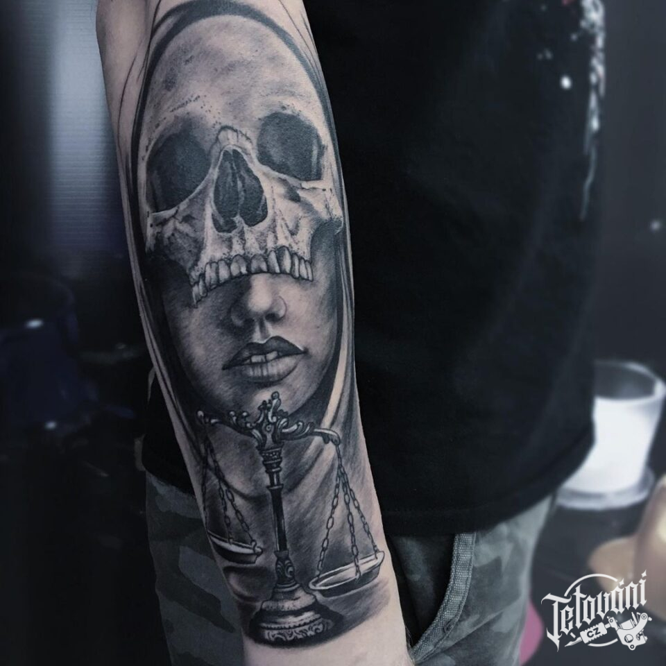 Tetování portrét ženy s lebkou na předloktí