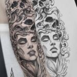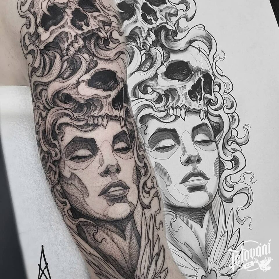 Tetování portrét ženy s lebkou na rameni