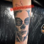 Tetování portrét ženy s maskou Muerte, smrt na předloktí