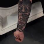 Tetování portrét ženy s maskou na předloktí
