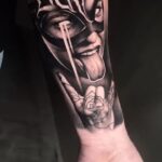 Tetování portrét ženy s maskou na předloktí