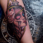 Tetování portrét ženy s maskou na předloktí