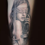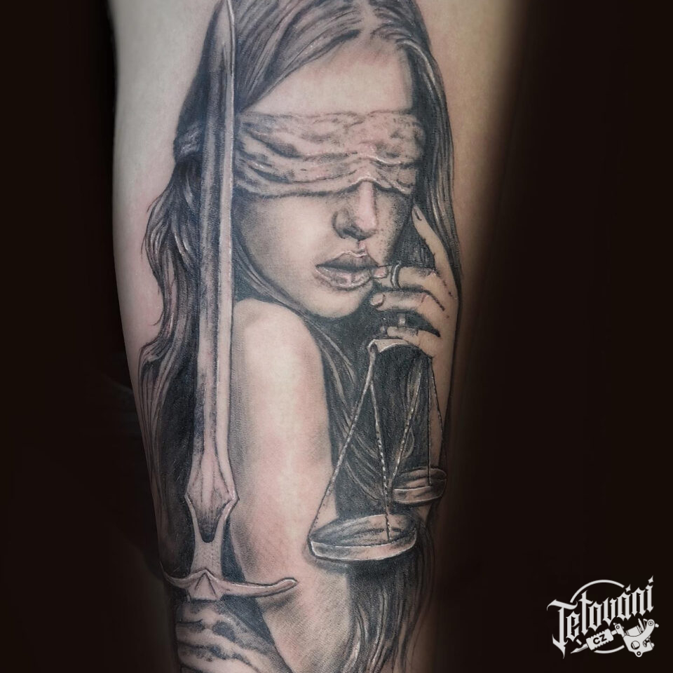 Tetování portrét ženy s mečem, lady Justice na rameni