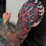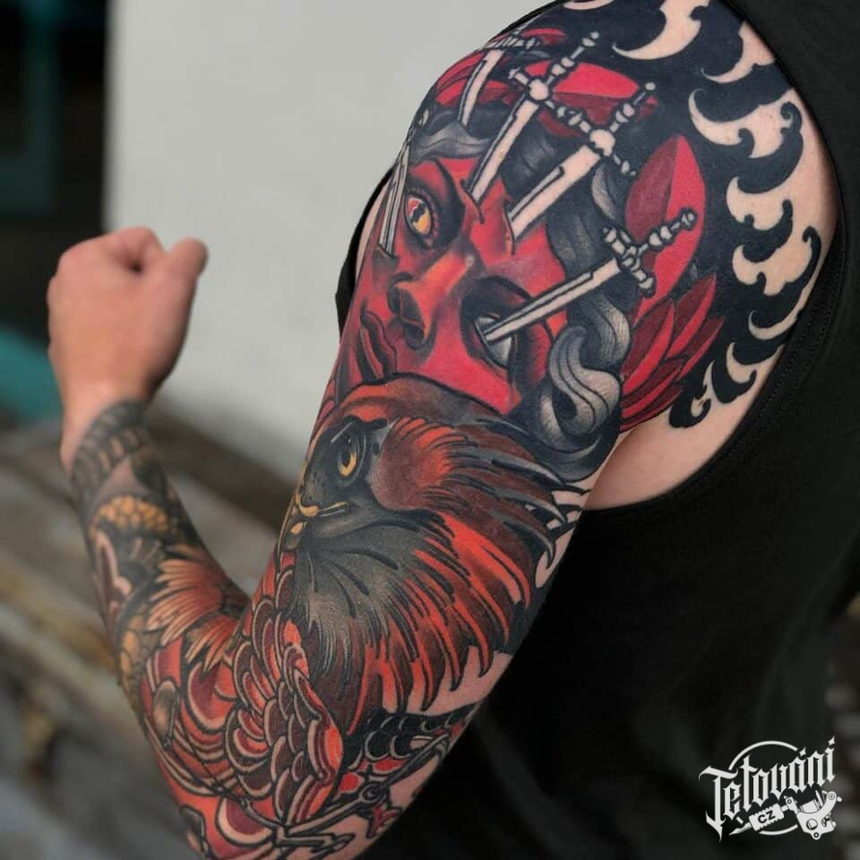 Tetování portrét ženy s meči a pták na rukávu