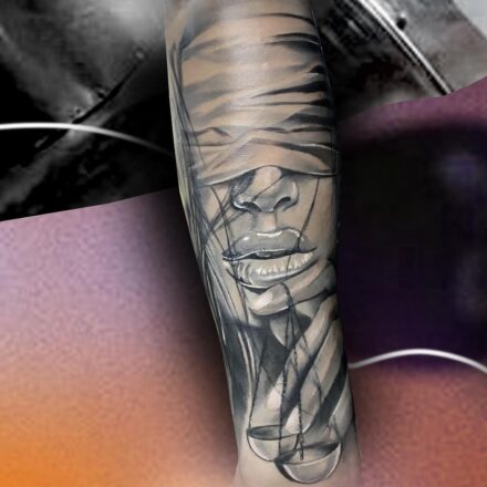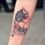 Tetování portrét ženy s nápisem, květiny na předloktí