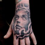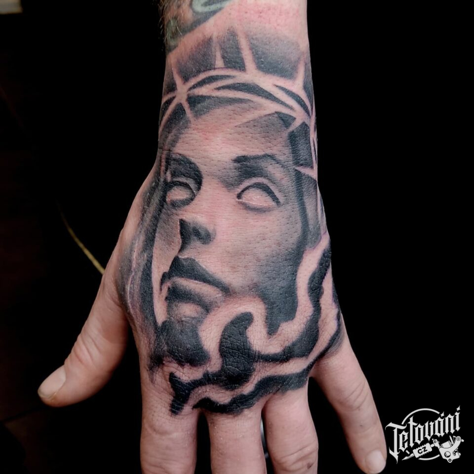 Tetování portrét ženy s ostnatým drátem na hřbet ruky