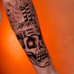 Tetování portrét ženy s pavoukem, lebka na předloktí