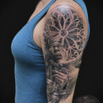 Tetování portrét ženy s rukou, předměty, Váhy znamení zvěrokruhu na rameni