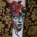 Tetování portrét ženy s růžemi na předloktí