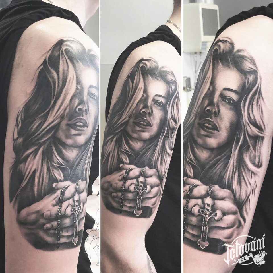 Tetování portrét ženy s růžencem na rameni