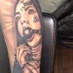 Tetování portrét ženy s růžencem, znaky a symboly na předloktí