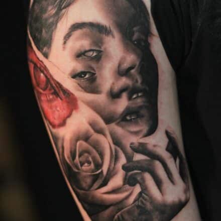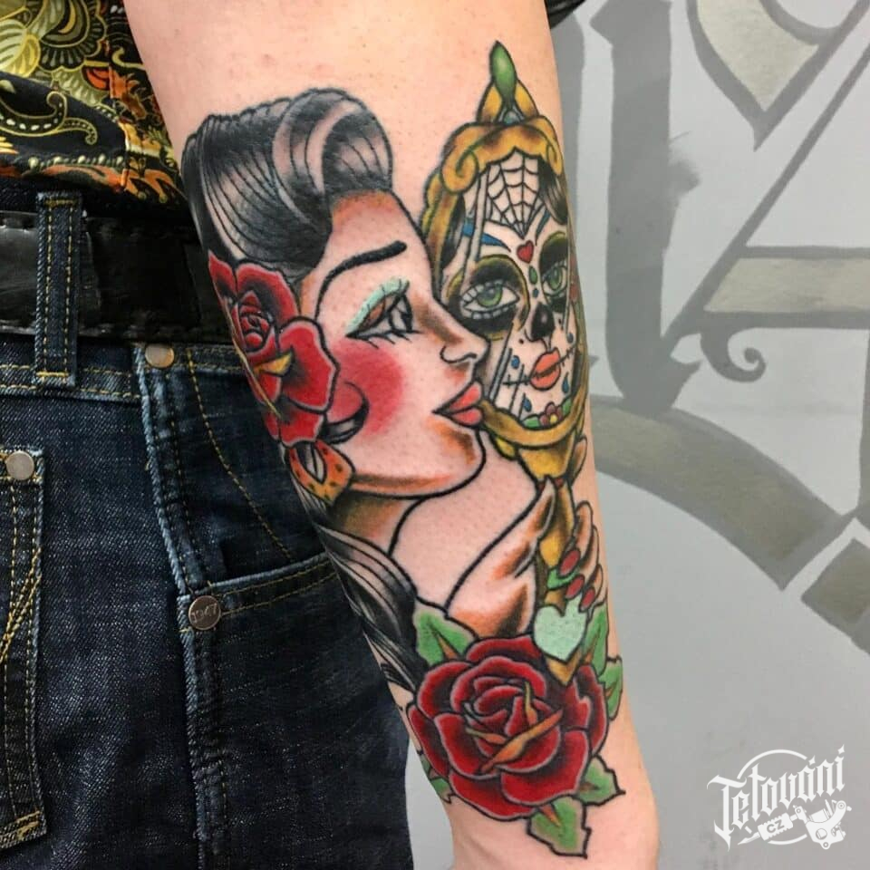 Tetování portrét ženy s růži a zrcadlem na předloktí