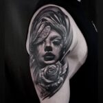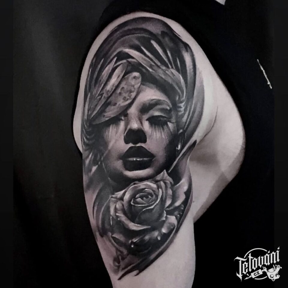 Tetování portrét ženy s růží na rameni