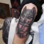 Tetování portrét ženy s vlkem na rameni