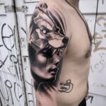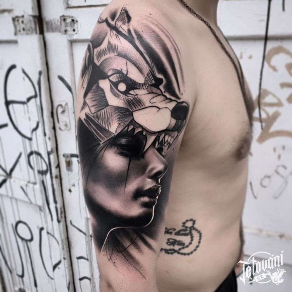 Tetování portrét ženy s vlkem na rameno