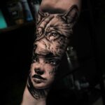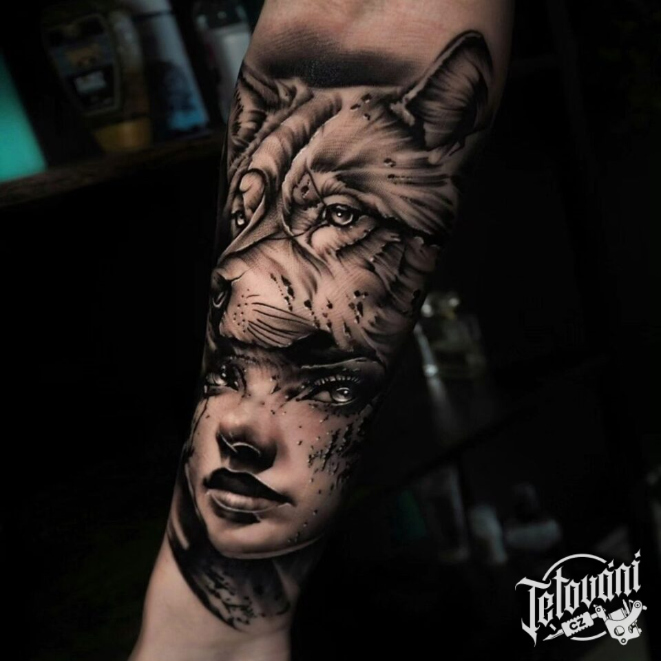 Tetování portrét ženy s vlkem na předloktí