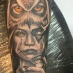 Tetování portrét ženy se sovou, zvíře na předloktí