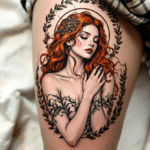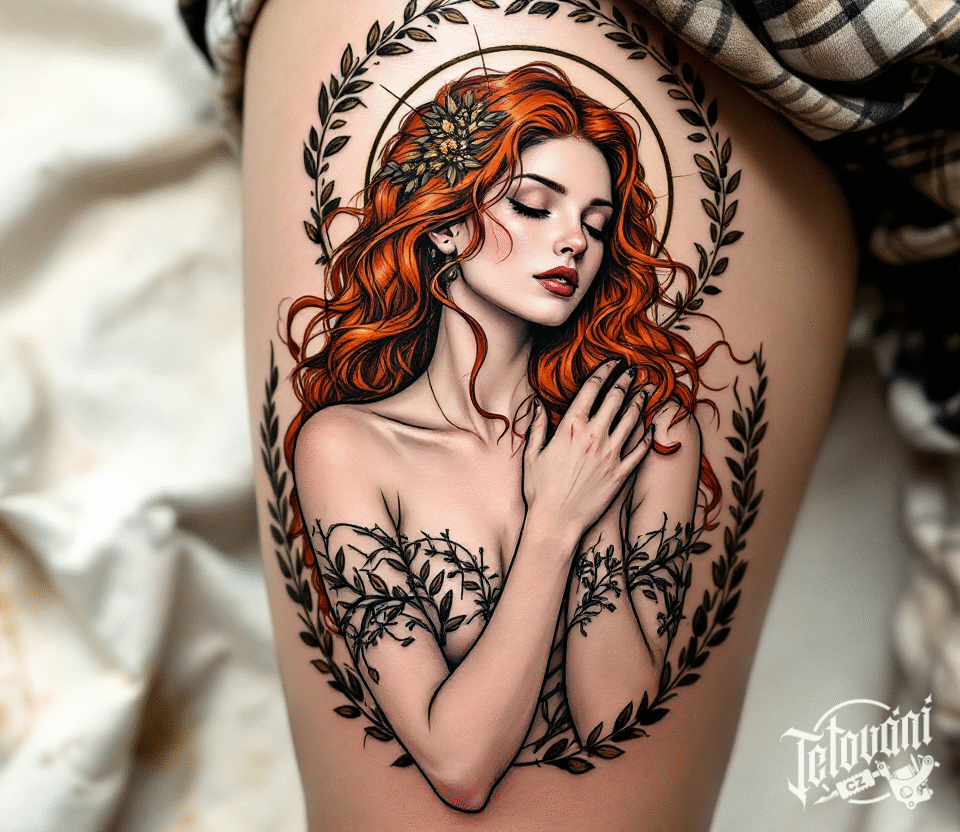 Tetování portrét ženy se zrzavými vlasy od Alfonse Muchy na stehně