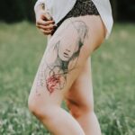 Tetování portrét ženy, srdce na boku stehna