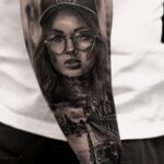 Tetování portrét ženy, symbol cestování, dopravní prostředek vlak na předloktí