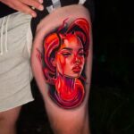 Tetování portrét ženy, symboly na stehno