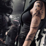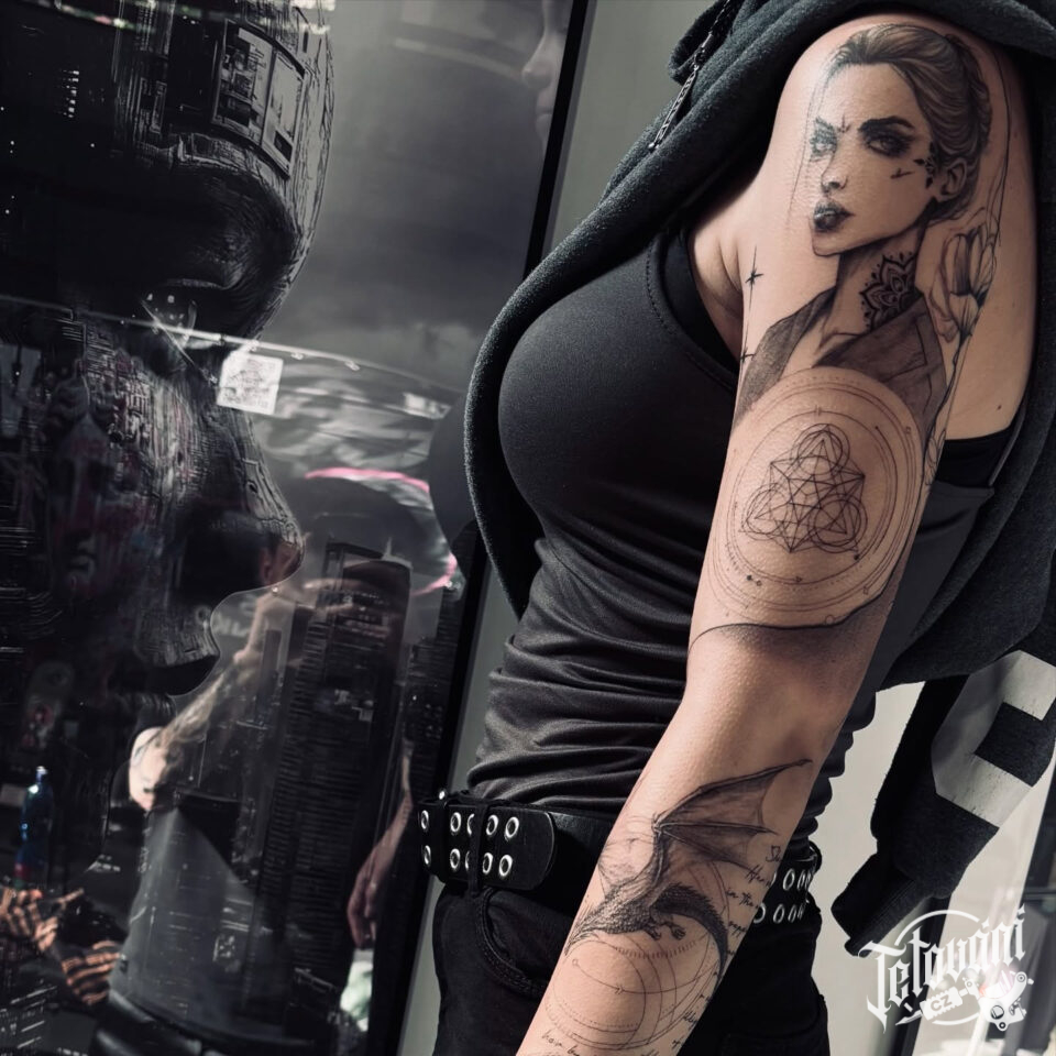 Tetování portrét ženy, tvary, mýtická bytost, drak, nápisy, rukáv