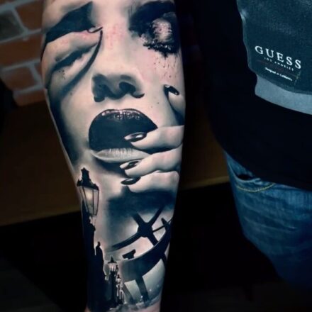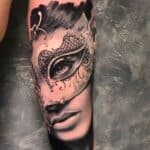 Tetování portrét ženy s maskou na předloktí
