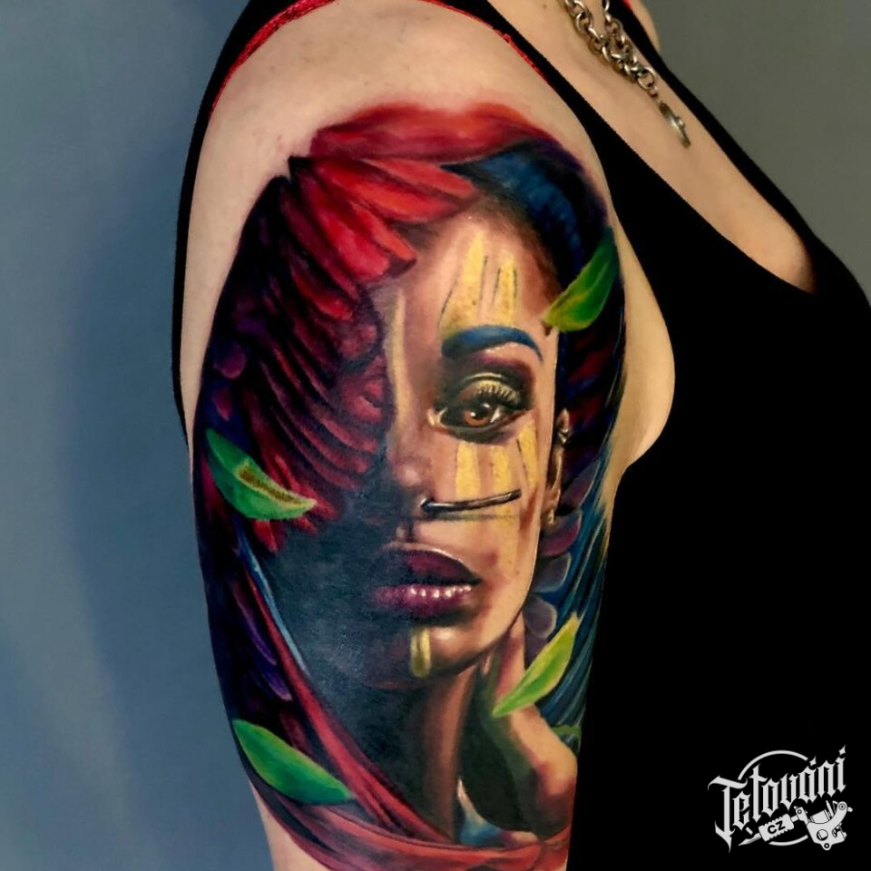 Tetování portrét ženy v přírodě, symboly na rameno