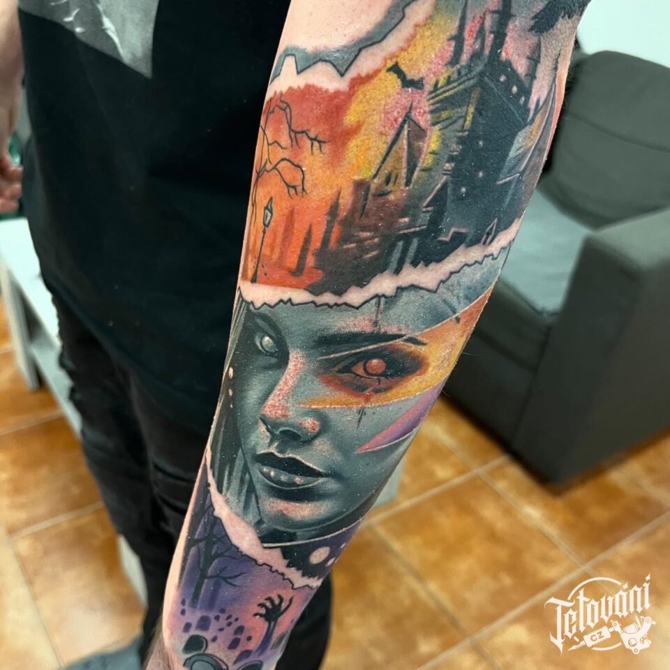 Tetování portrét ženy, zámek z filmů a pohádek na předloktí