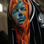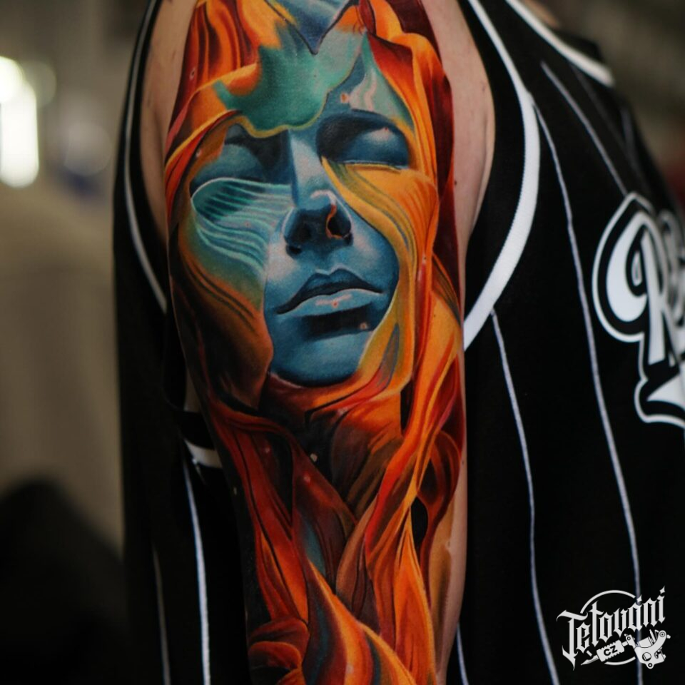 Tetování portrét ženy, živel oheň na rameno