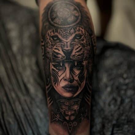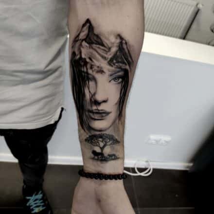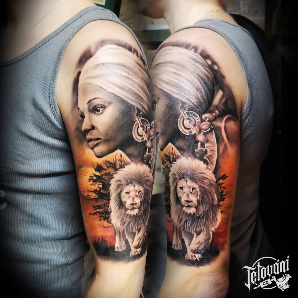 Tetování portrét ženy, zvířata, lev a příroda na rameni