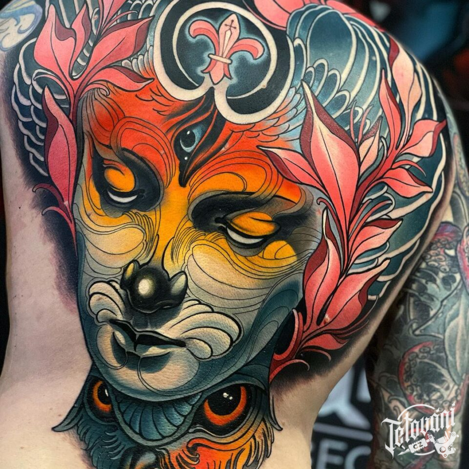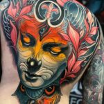Tetování portrét ženy, zvířata, liška a sova, květiny a znaky a symboly na zádech