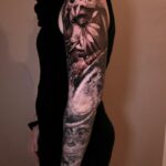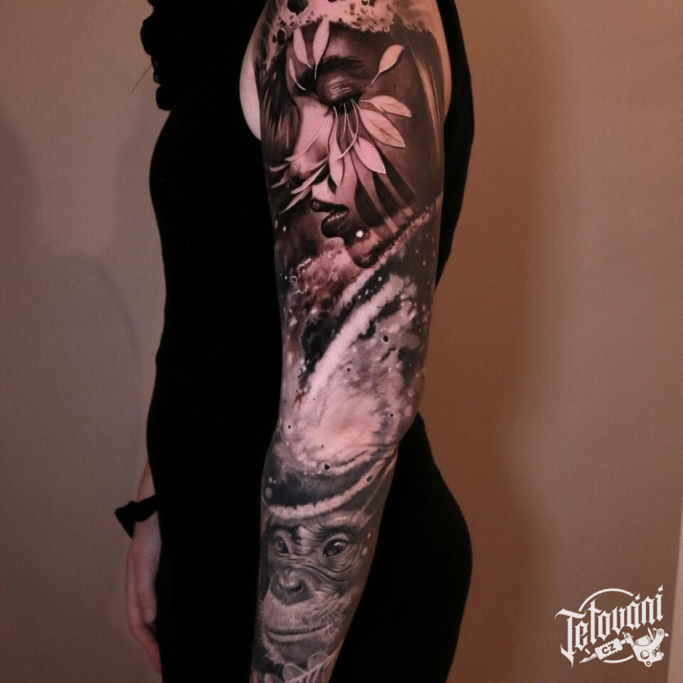 Tetování portrét ženy, zvířata, opice a vesmír na rukáv