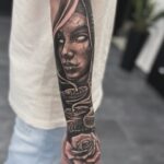 Tetování portrét ženy, zvíře had na, květina růže na předloktí