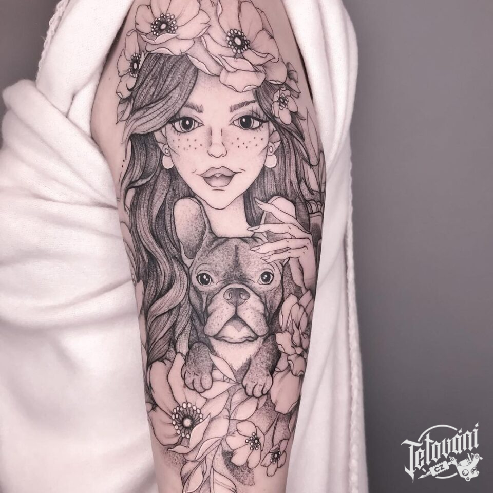 Tetování portrét ženy, zvíře, pes na rameni