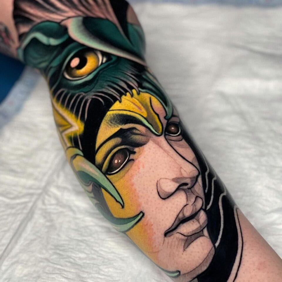 Tetování portrét ženy, zvíře s okem na koleno a holeň