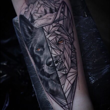 Tetování portrét, žirafa, tvary na paži