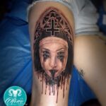 Tetování portrét, znamení zla na stehno