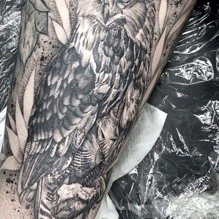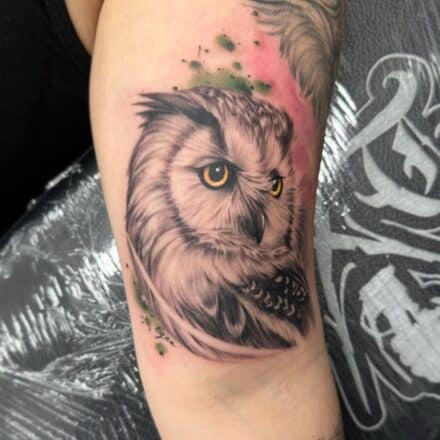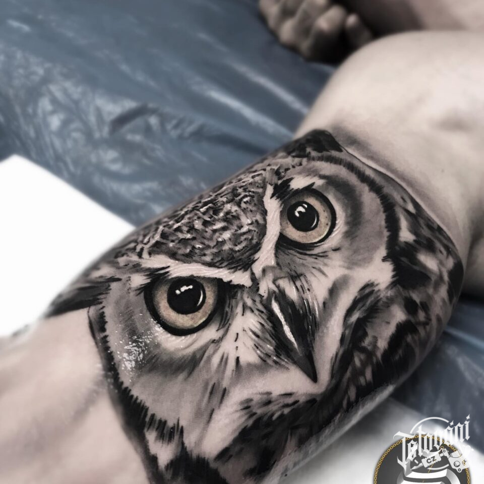 Tetování portrét zvířata, sova na paži