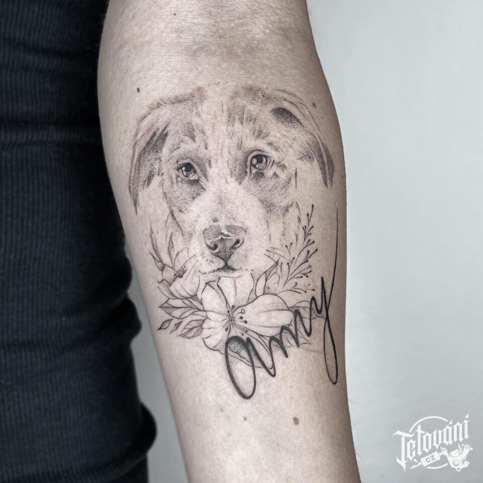 Tetování portrét, zvíře pes se jménem na předloktí