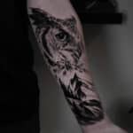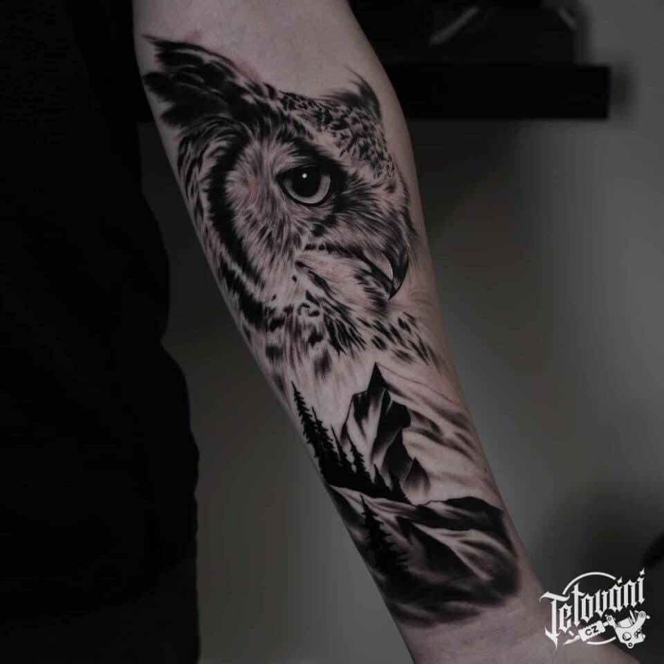 Tetování portrét zvíře sova, příroda, hory, les na předloktí