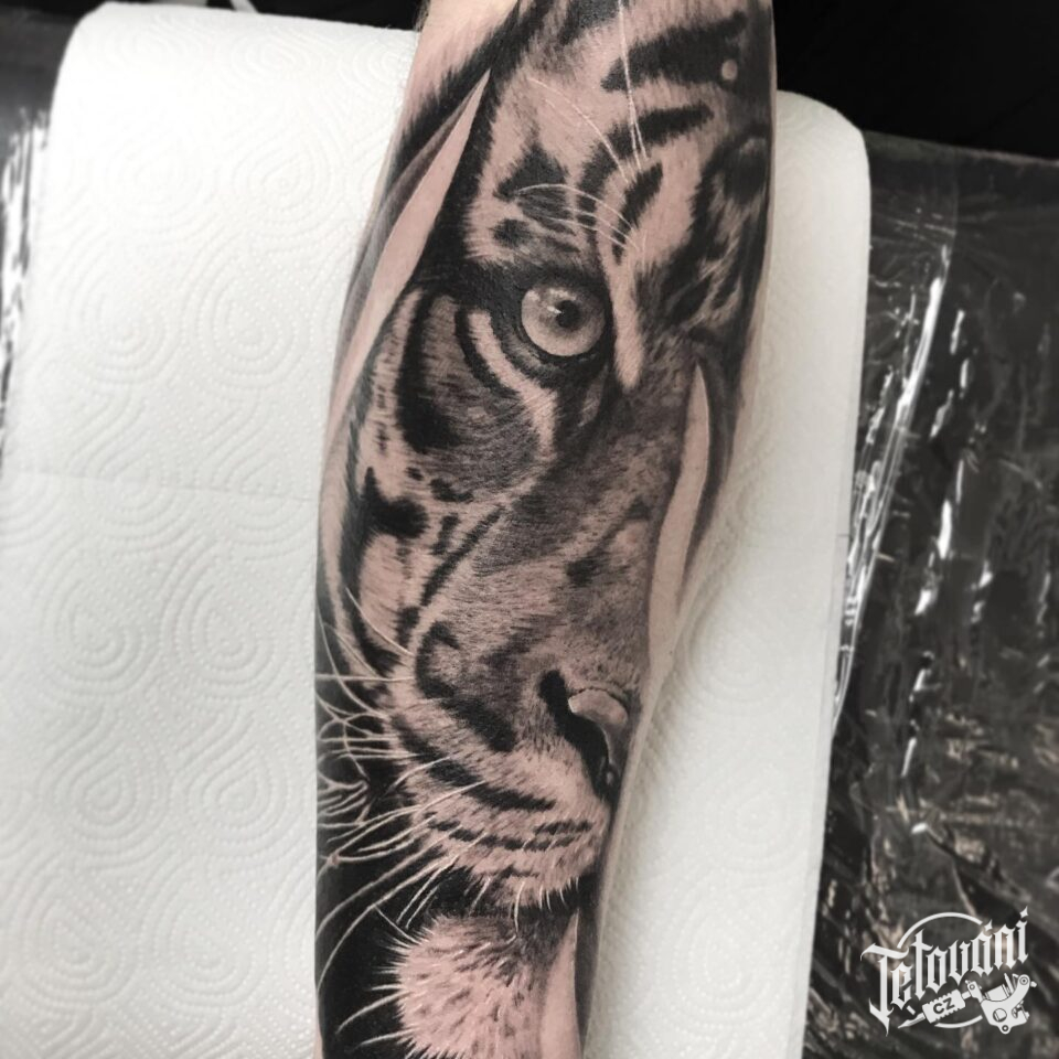 Tetování portrét zvíře, tygr na předloktí