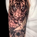 Tetování portrét zvíře tygr, příroda, hory, kompas, květiny na rameno