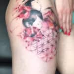 Tetování portréty a květiny na stehně
