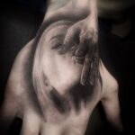 Tetování portréty a ruce, žena s prstem v puse na hřbetu ruky