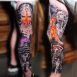 Tetování portréty, kříž, lebka na noze