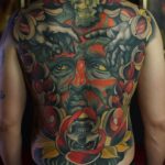 Tetování portréty, lebka, růže a ruce na zádech