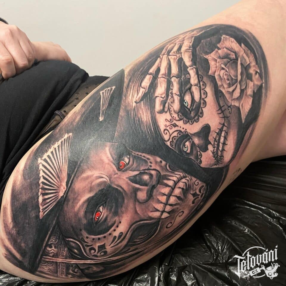 Tetování portréty Muerte, symbol lásky na bok stehna